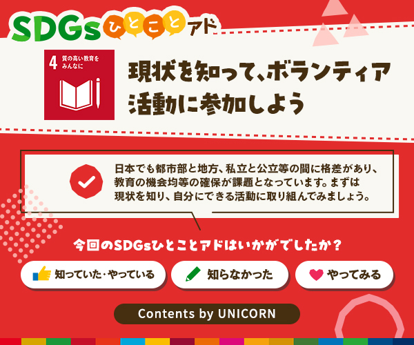日本でも都市部と地方、私立と公立等の間に格差があり、教育の機会均等の確保が課題となっています。まずは現状を知り、自分にできる活動に取り組んでみましょう。