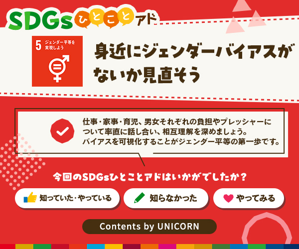 仕事・家事・育児、男女それぞれの負担やプレッシャーについて率直に話し合い、相互理解を深めましょう。バイアスを可視化することがジェンダー平等の第一歩です。