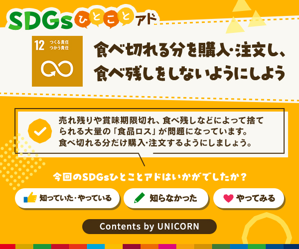 SDGs目標12のため、食べ切れる分を購入・注文し、食べ残しをしないようにすることを「知っていた・やっている」と答えた人は少なく、食品ロス削減への課題はまだまだ多そうです。世界には飢えに苦しむ人がたくさんいるなかで日本には食品ロスが大量にあるというのは悲しいことですよね。「食べ切れる分だけ」を日頃から意識していきましょう!